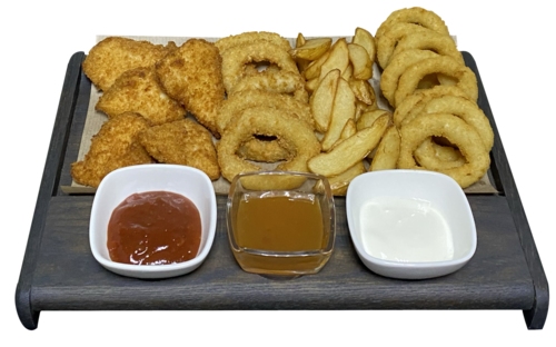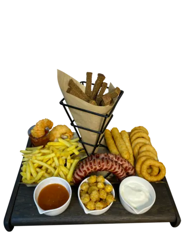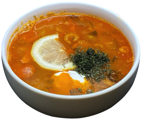 Колбаски п/к, картофель, лук, томатная паста, соленый огурец, маслины, оливки.