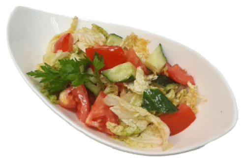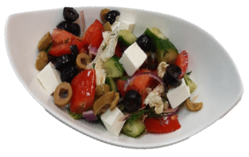 истья салата, сыр фетакса, помидор, огурец, маслины, масло оливковое, зелень, лук.Л