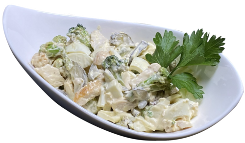 Куриная грудка, брокколи, маринованный огурец , яйцо, соус.