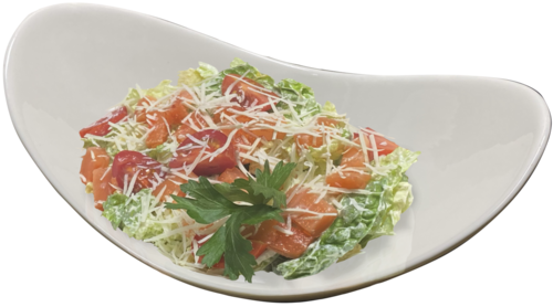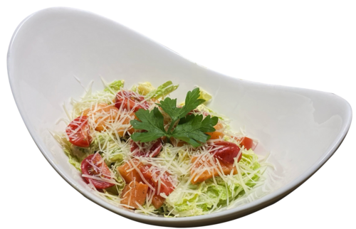 Лосось, листья салата, помидоры черри, сыр пармезан, сухарики, соус цезарь.