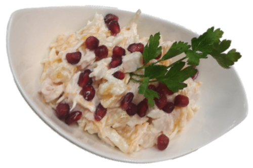 Куриная грудка, (копченая), сыр, гранат, консервированный ананас, майонез.
