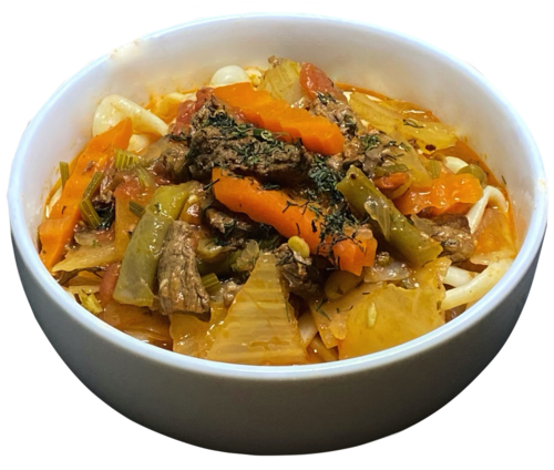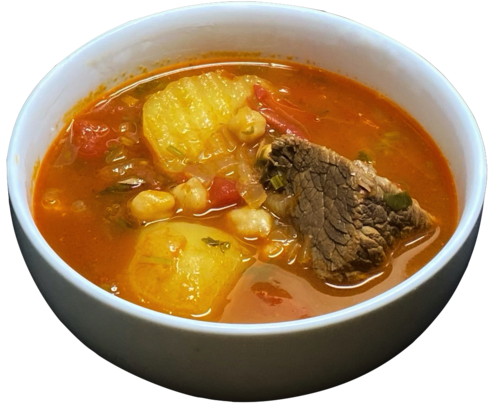 Говядина, картофель, лук, кинза, помидор, болгарский перец, нохут.