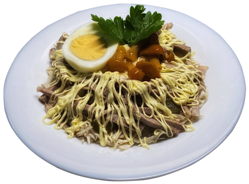 Язык говяжий отварной, куриная грудка отварная, огурец консервированный, опята маринованные, майонез, яйцо.