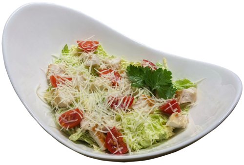 Курица, листья салата, помидоры черри, сыр пармезан, сухарики, соус цезарь.